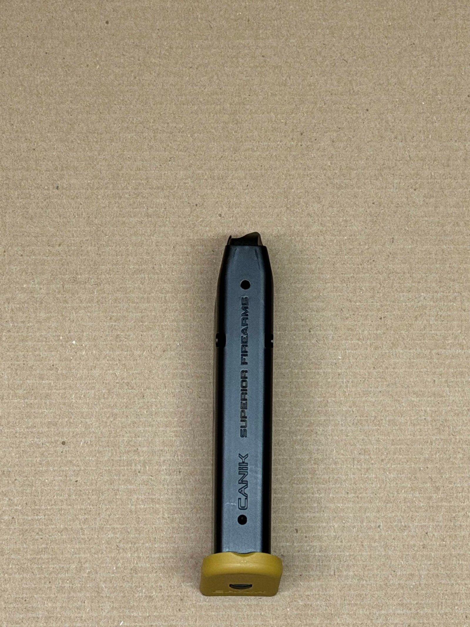 This brand-new Canik Factory OEM magazine is designed for the Canik METE SFx and TP9 SFx, offering a 10-round 9mm capacity with a premium gold finish. Constructed with 100% authentic factory Canik parts, this high-quality magazine ensures perfect fit, reliable feeding, and consistent performance.
